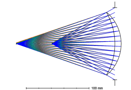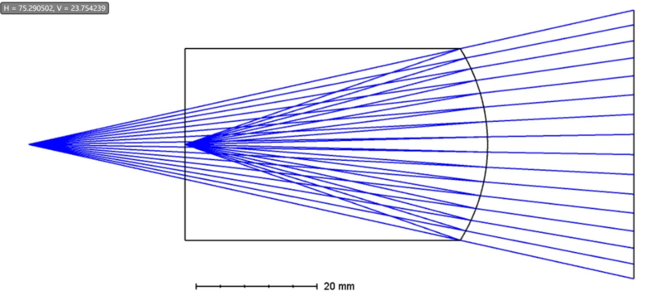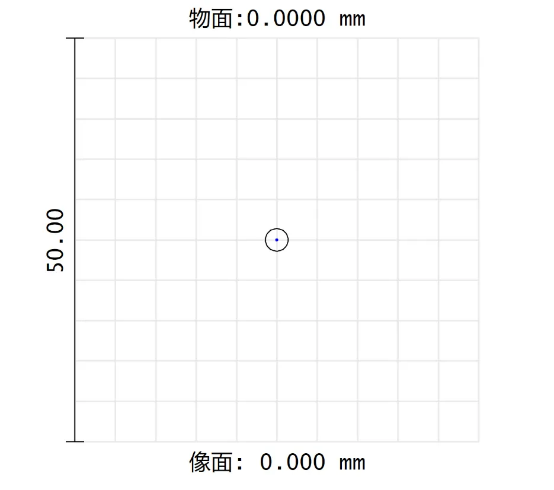 物体位于第一表面的曲率中心,第二表面满足零像差的第三种情况。此时假设透镜材料已知,我们可以根据上面的数学表达式得到透镜的全部其他参数。在软件中进行仿真,得到如下结果: