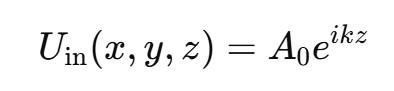 透镜引入的相位延迟由透镜本身的参数决定,其作用相当于将光线聚焦到焦点f上,因此平面波经过透镜后变成了一个汇聚的球面波: