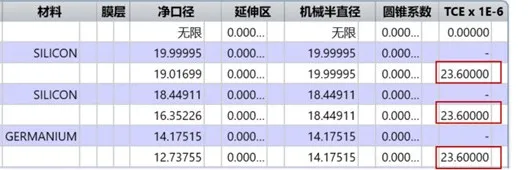 假设我们使用铝合金作为机械材料,对应的热膨胀系数为23.6E-6,因此在对应的空气间隔部分热膨胀系数输入23.6,注意ZEMAX自带E-6的单位(不同软件这里的单位是不同的,比如CODEV),因此我们只需要输入数字部分即可。
