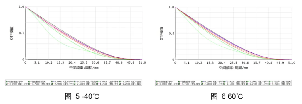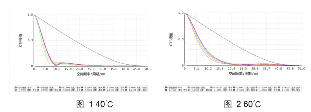 在进行材料替换后,可以看到系统的MTF在-40℃—60℃基本接近衍射极限。