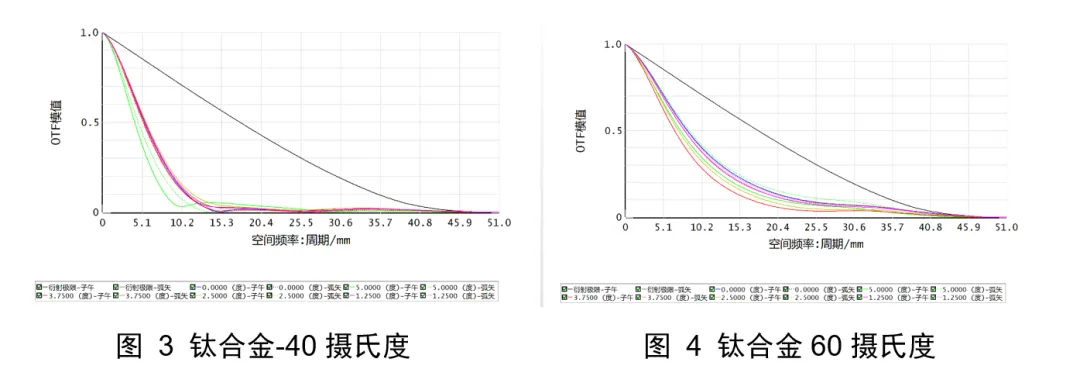 与20℃相比,-40℃和60℃时的MTF发生了明显的下降。这是使用铝合金作为机械结构的MTF结果,如果替换为钛合金,输入TCE值为9.5,下方两个图给出了相应的MTF结果,显然在本文演示的案例中,使用钛合金的MTF下降程度要轻于铝合金。