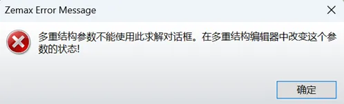 接下来要对系统进行进一步的优化,此时多重结构编辑器已经成为我们新的镜头数据编辑器,此时若还在镜头数据编辑器中修改空气间隔等参数,ZEMAX会给出相应报错。如果想要修改曲率半径或者将其设置为变量,对应于多重结构编辑器中的CRVT操作数,根据每个面的编号即可找到对应的曲率半径,同理厚度和间隔对应THIC操作数,如果使用了非球面等特殊面型,可以在多重结构编辑器找到PRAM操作数,可以使用它调整非球面的高次项系数。