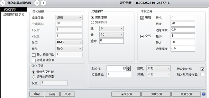 在完成变量设置之后,对评价函数也需要进行进一步的修改,在优化向导中有一个结构选项,可以选择想要添加约束的结构,由于在多重结构编辑器中要求曲率半径和厚度参数均热拾取结构1,因此我也可以将空气玻璃约束仅添加于结构1上,其他结构只进行像差约束。