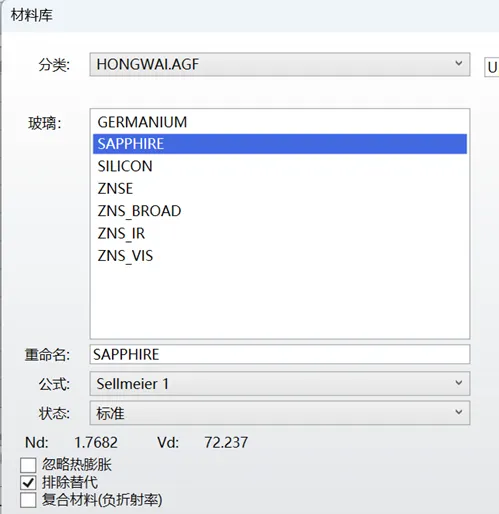 在完成设置之后,进行局部优化,优化之后MTF有了一定的提升,但依旧无法到达衍射限要求,很多人都能想到这时候可能需要通过替换玻璃材料来进一步提高成像质量,在材料替换过程中有时材料的范围是被限定的,只能从有限的材料中选择,但是已有的玻璃库一般包含生产商提供的所有材料。此时,可以采取新建材料库的方式,通过创建一个新的玻璃库,在其中只放置可以选择的材料,通过使用这样的库来进行材料替换,便可以保证所有材料均是可以选用的。当然在材料替换时,依旧有一些材料是不被希望参与透镜的组成,比如蓝宝石,此时可以勾选排除替代,就可以保证优化时,该材料不会被透镜使用。