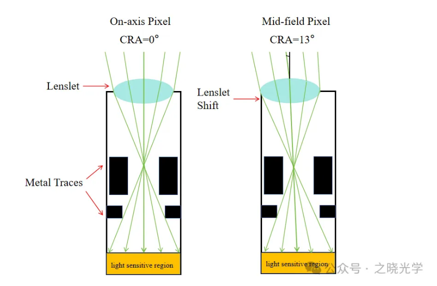 CRA,即主光线入射角,指的是在光学系统中,主光线(通常指通过光学系统孔径光阑中心的光线)与光轴之间的夹角。这个角度在光学设计和分析中扮演着重要角色,因为它直接关系到成像的位置、大小以及光学系统的整体性能。在像平面处,CRA 决定了成像点偏离主光轴的程度,对于非对称光学系统和具有特殊成像要求的系统来说,CRA 是一个必须精确控制的参数。现代光学成像,特别是在可见光波段,最常用的探测器就是CMOS,为了提高信噪比,像元前往往搭配有微透镜阵列。那么对于微透镜阵列而言,CRA变化将影响探测器的实际响应。
