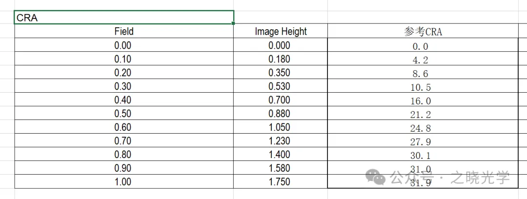 这些要求对光学系统的设计提出了挑战,尤其是在广角镜头、大视场光学系统以及非对称成像系统中,如何合理控制 CRA 以满足拜尔阵列的需求成为光学设计中的一个重要课题。设计师们需要综合考虑光学系统的结构、透镜参数以及成像要求等因素,通过精确的设计和优化来实现对 CRA 的有效控制。对于一些具体的设计要求,可能在任务书中会给出各个视场对应的推荐CRA值,例如下面的例子所示。若没有给出详细的参数,一般在探测器应用手册中也会给出最大的CRA可接受范围,这就给我们提出了一个光学设计中的约束条件。