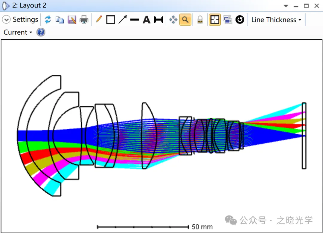 根据设计要求,我们初步设计了一个由十六片透镜组成的光学系统,包括三片非球面透镜设计。初始设计的光学系统结构如图所示。