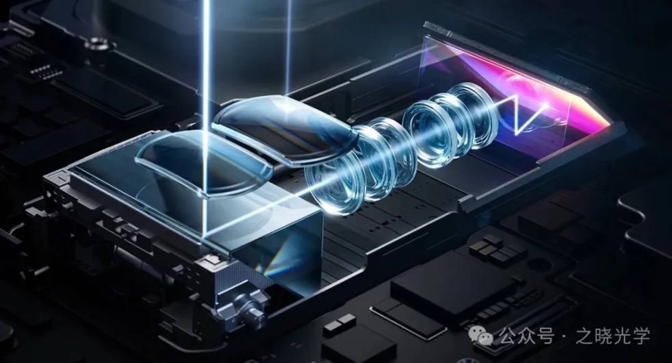 在连续变焦光学系统中我们可以理论证明,如果变倍组做线性运动,那么补偿组一定做非线性运动,整体的加工成本会更高,而上图这种结构形式,只需要控制平板反射镜的位置即可,实际上结构更为简单。但是这种方案也会带来一定的挑战,例如在pura80中,实际采用的是棱镜控制光路切换,为了折叠光路,压缩空间,像面前还有一个棱镜。这种布局不利于通用的AA制程定心,将上述方案量产还是有一定的挑战的。