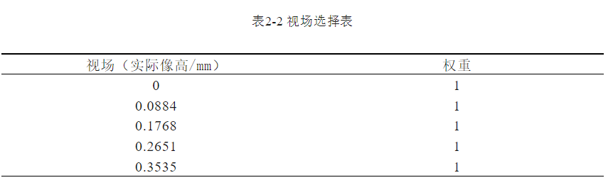 在初步优化之后需要重新将视场设置为0.3535mm半高,进行更准确的优化。表2-2是用像高表征的视场选择表: