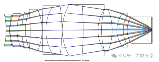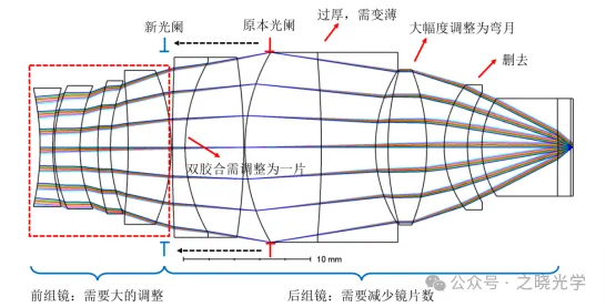 对于架构问题,首先要对孔径光阑的位置做优化调整。初始结构将光阑置于第七透镜的第一表面,形成前组6片、后组5片的配置。从经验角度出发,我们希望将光阑放在更靠左的位置,采用前组3~4片、后组5~6片的“鱼”形结构设计,以达到更好的像差平衡效果。前组负责光线的会聚与发散转换,后组完成光束的最终聚焦。这种架构已被多家国际知名光学厂商广泛应用于高性能显微物镜设计中。