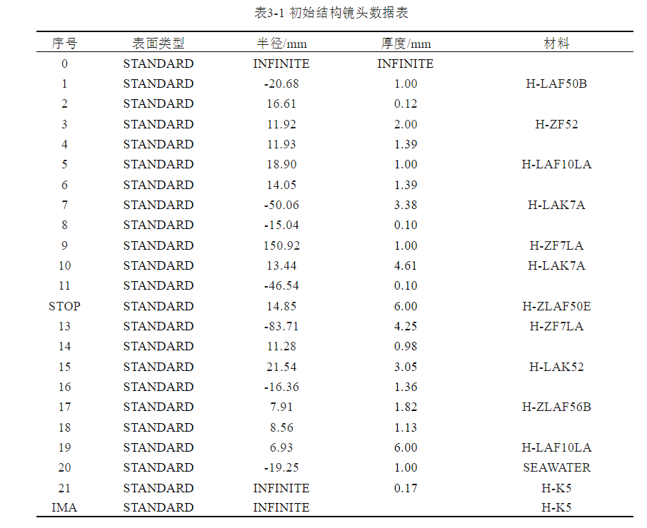 调整为水浸物镜的镜头数据如表3-1所示,镜头二维图如图3-1所示。
