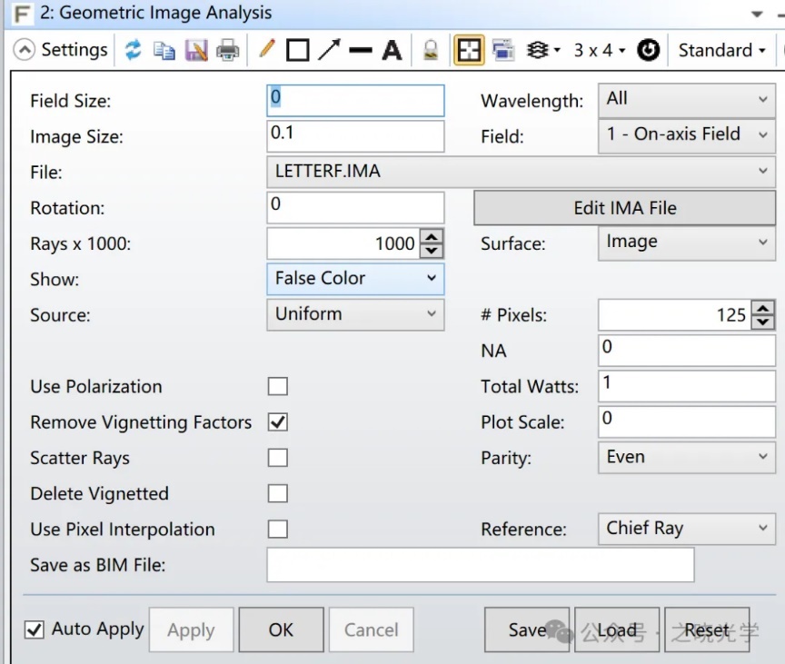 在ZEMAX中有一个常用的工具,就是几何图像分析,我们可以利用该工具查看整形效果。点开该功能,我们可以看到这里设置的参数很多。