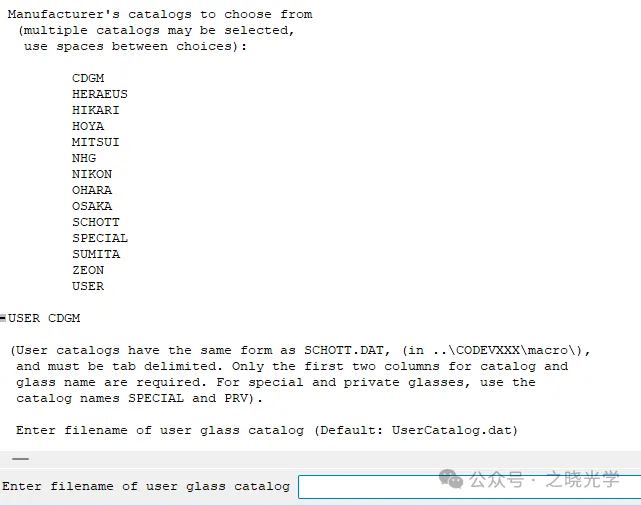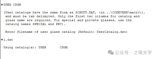 在输入需要使用的玻璃库中,我们可以同时使用CDGM和USER(通过宏添加的材料都在这个里面)。如果选择USER玻璃库,系统会需要我们再输入一个文件名,这个就是我们刚才保存的文件。将刚才的玻璃声明文件保存为"1.dat",放在工作目录下,这里就直接输入"1.dat"即可。