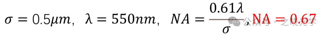 那么在倒置设计时,系统的外部参数通常需要重新计算,我们就举一个实际计算的案例,假设我们设计的显微物镜中心波长0.5um,需要分辨的物方最小间隔为0.5um,那么我们可以确定物方NA的最小值: