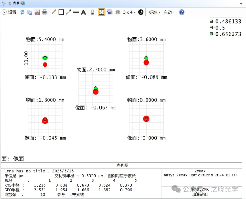 从点列图上看此时艾里斑半径恰好为0.5um,说明我们的计算是没有问题的。除了孔径大小需要计算,物像对应的高度也需要转换一下,但这个比较简单,就不提了。