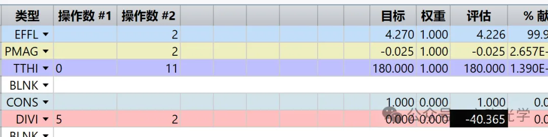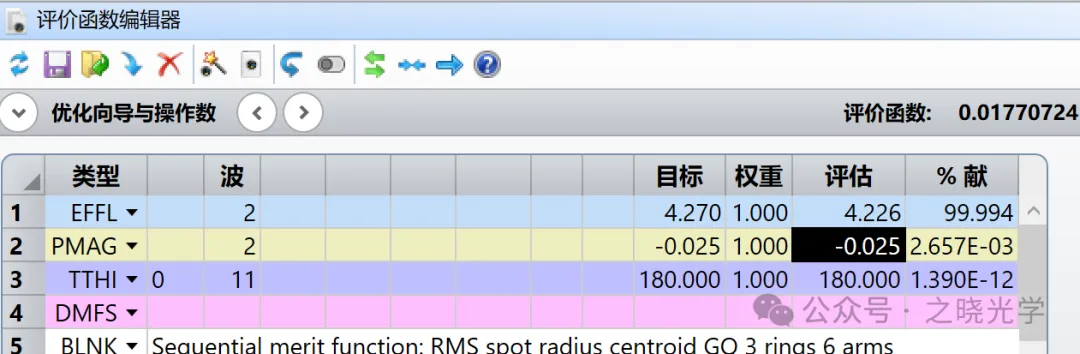 由于目标值本身比较小,评估值即使偏离目标值,产生的贡献也比较小。根据我的长期观察,很多人这个时候采用的一种方法是提高这一句操作数的权重,我个人不推荐这种做法,因为不一定能把放大倍率优化的多接近-0.025,还会对系统整体的优化效果有比较大的影响。