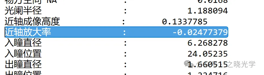 以我们的这个初始结构为例,在此时的评价函数中可以看到,此时的近轴放大倍率为-0.025,但是如果我们打开一下系统数据报告就会发现,此时的放大倍率和-40倍其实有偏差。