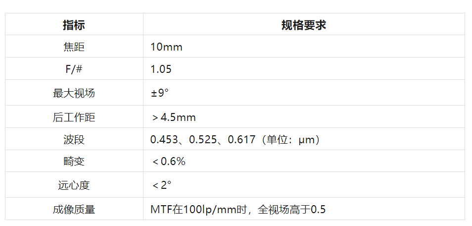 投影镜头的指标上次我有详细讲过,同时之前我已经写过一些特定光学系统初始结构的理论计算方法,欢迎大家回顾。首先,我们给出光学系统的主要技术指标如下: