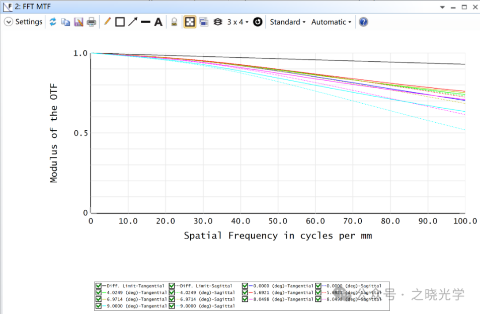 在本期文章中,我们深入探讨了一种具有较小F数的投影镜头的初始结构设计。通过详细的指标设定和初步优化,我们成功地构建了一个紧凑且高效的光学系统。该系统采用了球面透镜设计,所有透镜均选用CDGM玻璃,确保了高熔融频率和成本效益。优化后的系统总长仅为25mm,后截距为4.9mm,展现了卓越的紧凑性。MTF曲线在93lp/mm处全视场高于0.5,表明成像质量达到了高标准。色差得到了有效控制,系统总体畸变小于0.6%,远心度小于1.7°,满足了光学性能要求。