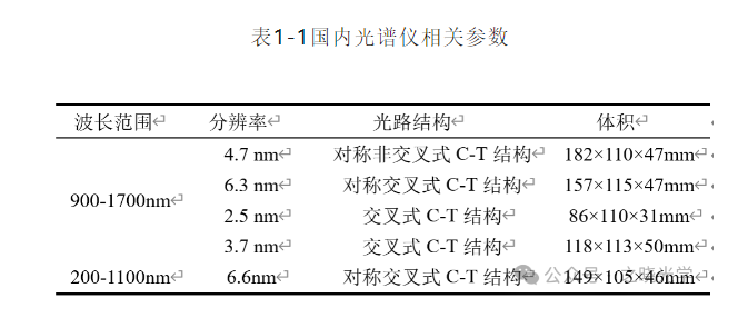 光谱分析以波长为界限划分可以分为为几个波段:紫外(200nm-380nm)、可见光(380nm-780nm)、近红外(780nm-2500nm),其中每个波段都有各自不同的应用领域,在这几个波段之中,近红外光谱分析应用领域占比最多。最开始人们就发现近红外光谱分析在农业方面可以得到很好的应用,如通过近红外光谱对谷物含水量进行检测,以此来衡量农作物品质。美国国家谷物检测中心(FGIS)最先运用该方法检测了谷物的成分并对其质量进行评价,同时对近红外光谱分析法建立了一套对应的检测标准。此后,人们逐渐开发出近红外光谱分析方法在检测和分析环境污染物、检测生物体液与药物成分等领域的应用,也因此更受重视。目前国内公司光谱仪相关参数指标如表1-1中所示: