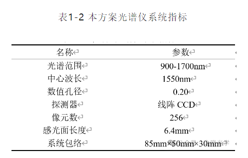 从上表可以看出,国内光谱仪波长范围以900-1700nm居多,本文采用光路以交叉式C-T结构为基础进行了改进,从体积上看,这样的结构体积最小。设计技术指标如表1-2所示: