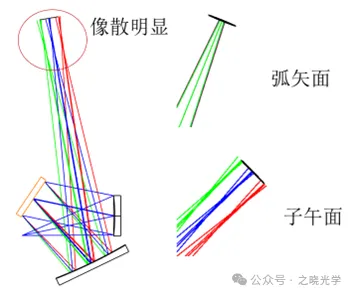 为了实现交叉C-T结构,两个反射镜具有一定倾斜量,考虑到像差控制,使第一反射镜倾斜10°,第二反射镜倾斜15°。由于系统整体不具有对称性,将产生明显的像散如图2-3所示,因此在焦面前加入柱面镜进行矫正。