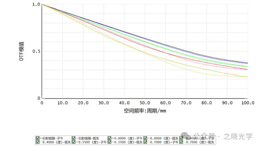 在前面的初始结构基础上进行优化,优化过程中将反射镜4简化为球面,得到的结果点列图如图6所示,MTF曲线如图7所示: