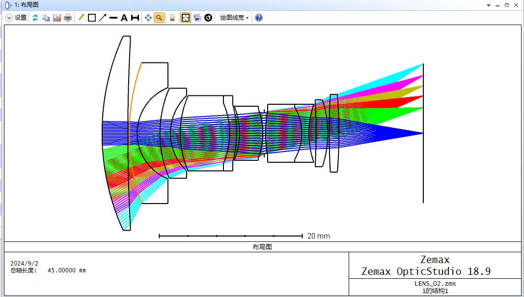 优化的过程比较复杂,也不是本文的重点,这里就直接展示一下最后的设计结果吧,优化的过程中我为了提高优化的速度,把Zemax文件导入到了CodeV里面,在CodeV里再进行了优化。可以看到系统整体看上去还行,孔径光阑前的那个透镜看起来也不是特别理想,光焦度看起来有点大了,传函,畸变等指标也已经满足要求。