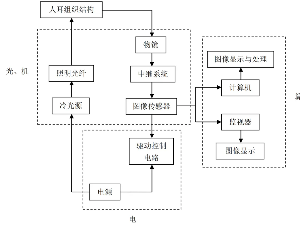 现代内窥镜系统是光、机、电、算一体化的系统。光学系统包含成像系统和照明系统;机械结构确保设备的稳定性和耐用性;电子系统为照明、图像传感器及相关设备提供电力,并实现各个模块的控制;计算机则用于处理图像,使医生能够通过显示器观察更加清晰的图像,并记录、保存和再现。这四个部分的协同工作构成了现代内窥镜的整体设计。光、机、电、算四个系统之间相互配合,最终构成了整个的内窥镜系统。