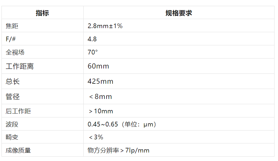 在本案例中,我们将基于以下关键设计指标,对硬质内窥镜的初始光学结构进行优化。虽然现在的内窥镜常常不包含中继系统,但这个案例仍可以为我们加深对光学系统的理解提供参考。