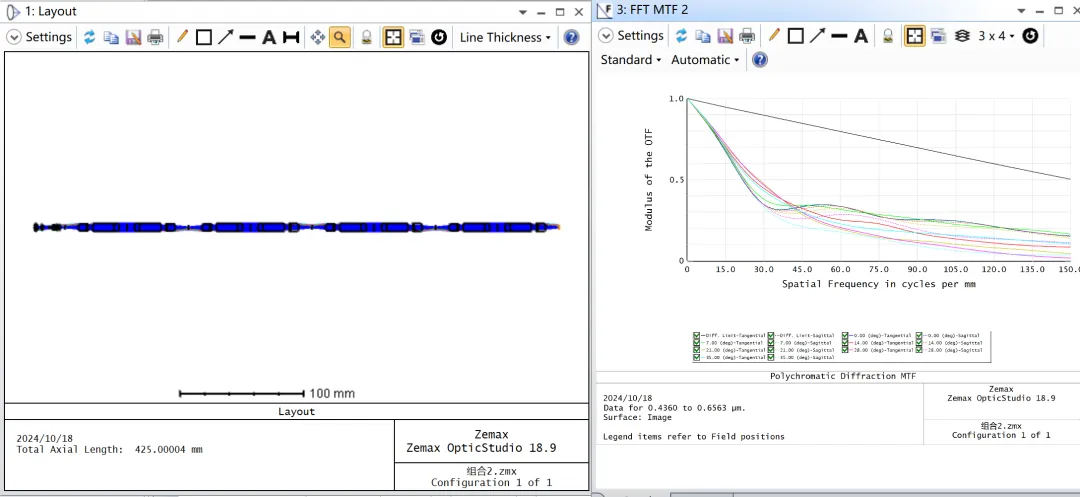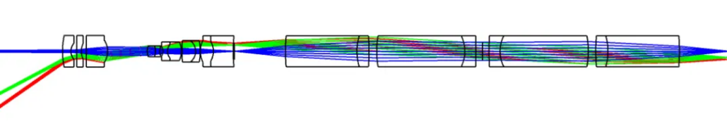 如果还有时间,可以结合公差分析情况对现在的结果再做调整,特别是对倍率色差做进一步抑制,例如可以考虑在物镜组使用高阿贝数材料(成都光明FK/QK/ZPK系列玻璃)。同时组合之后,由于物镜组和中继镜组的像差存在相互补偿,在现在的基础上,透镜数量有一定的简化空间,这是模块化设计的一个麻烦之处,这里就不再演示了。