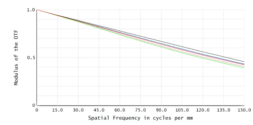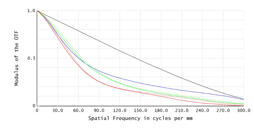 我们先来看一下传递函数,在像方300线的时候已经要截止了,我们的指标要求物方分辨率7线对,这个指标如何保证呢?这就是本文我想讲的第一个问题。