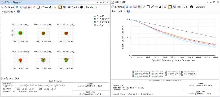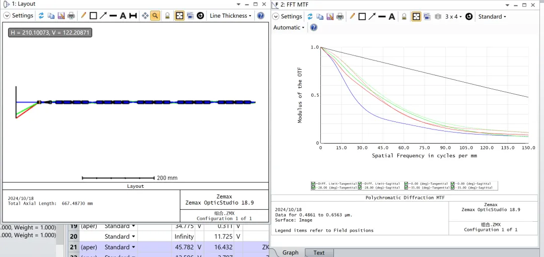 所以为了让整体的像差尽可能小,需要对系统进行整体优化,在优化的操作数中添加 EFFL 来调整整个系统的焦距,加入操作数 DIMX 来观察系统的最大畸变,通过添加操作数 OPLT 使 DIMX 对应的数值小于所要求的畸变数值。在对系统进行整体优化时,要多次少量进行优化,一步步改善优化函数,尽可能使物镜和中继镜拿出来都有较好成像质量。组合后再优化的结果如下: