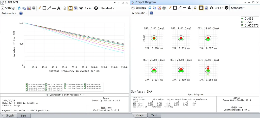 初步优化结果如下所示,中继镜前后对称,所以放大倍率为-1,这里物镜我们也看150线对。