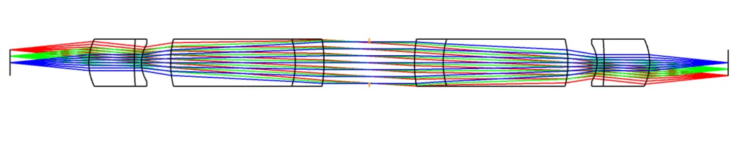 这里是本文的第二个关键点,光学系统的衔接要遵循光瞳匹配原则,首先我们知道中继镜组之间可以相互匹配,所以中继镜应为双侧远心。为了保证物镜的出瞳和中继系统的入瞳相匹配,还要设置操作数 EXPP 来调整物镜的出瞳位置,以确保能与双侧远心的中继系统相匹配。假设一组棒状镜组合总长为100mm,一共用四组,这里物镜组总长控制在25mm。