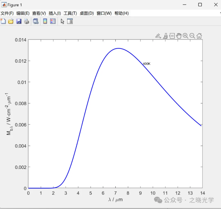 从图中可以看到,5700K的黑体,在500nm波长处具有最高的辐射出射度,能量主要集中在可见光波段。而当我们把黑体辐射温度改为400K,如下图所示,可见此时能量主要集中在红外波段。
