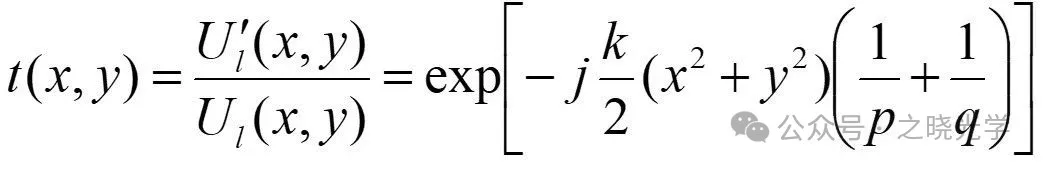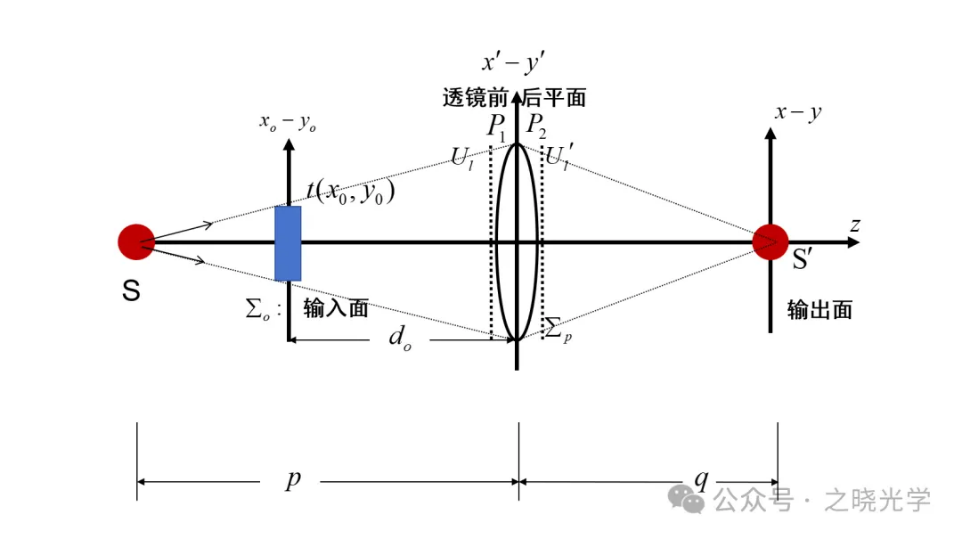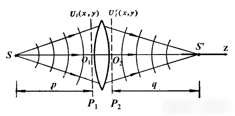 如图所属,入射波是一个发散的球面波,出射波是一个汇聚的球面波,我们可以写出P1和P2面上的波面分布(大家在物理光学中应该都学过):