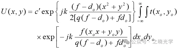 进一步的,我们可以利用透镜的位相变换作用推导出一个结论:平面型透明片,在单色光照明下,通过透镜的位相调制作用,在照明光源的共轭平面上可以得到透明片的傅里叶变换。