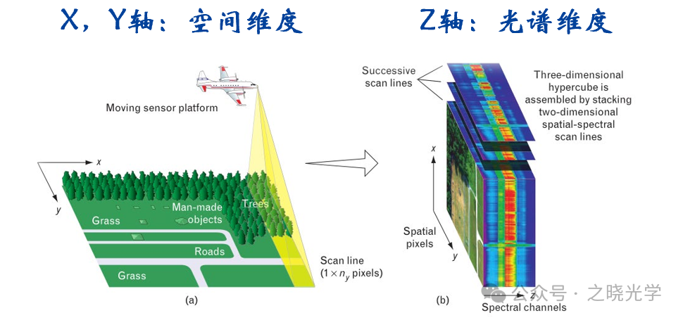 如果我们给这个二维矩阵增加一个维度,在空间维度(X,Y)之外的第三个维度记录该像素点对应的光谱信息,这就像给每个像素点装配了微型光谱仪,形成包含数百个连续窄波段的三维数据立方体(空间维X/Y+光谱维Z)。