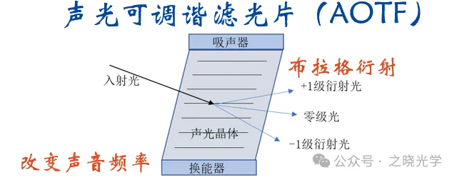 除了以上两种分光方式,在某些特定的结构中,还可以采用各类新型器件作为分光元件。例如,声光可调谐( AOTF)滤光片主要由吸声器、双折射单轴晶体和压电换能器组成,利用入射光和超声波在双折射晶体中的相互作用进行工作。 加载于其上的压电换能器将电信号转换为同频率的超声波,超声波在晶体中传播时和入射光发生相互作用,满足布拉格衍射条件的入射光波发生布拉格衍射。衍射光的波长与声波频率相对应,通过改变声波频率,即可改变衍射光波长,从而实现AOTF的分光作用。因此,通过电信号的调谐即可快速、随机改变输出光的波长 。