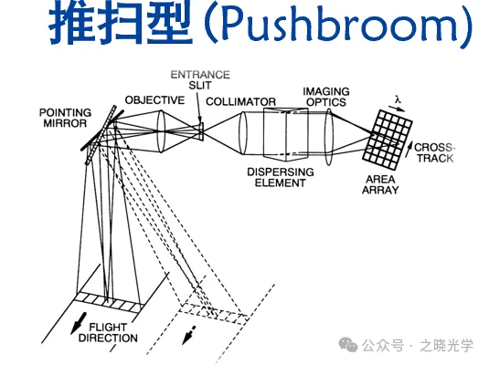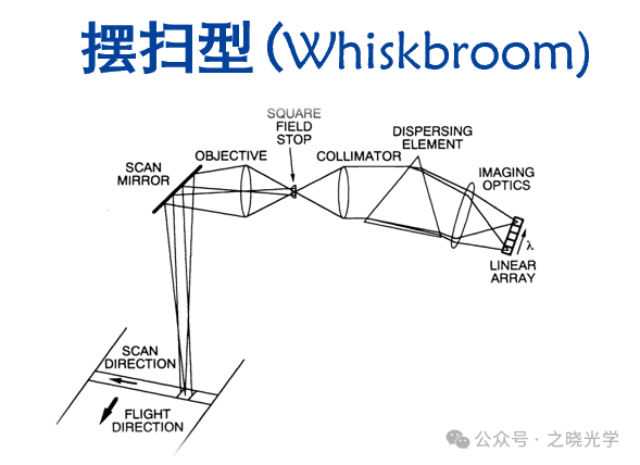 由于探测器都是一维或者二维的,我们想要获取三维信息需要进行扫描。成像光谱仪在分光之前一般需要搭配一个前置望远系统,可以采取几种不同的扫描方式,以同时获取空间维度和光谱维度的信息,可以分为摆扫型,推扫型和凝视型三类。