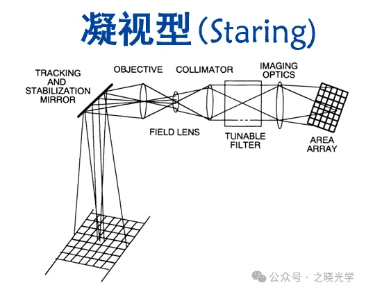 此外还有一类凝视型高光谱相机,同样采用面阵探测器,光路中一般包含一个编码器,例如DMD或AOTF,系统多次采样后通过计算还原空间和光谱信息。