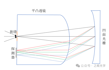成像光谱仪可以采用的结构形式较多,其中比较典型的是offner型。光束由狭缝入射,经过一组近似对称的反射系统,其中第二个反射镜为凸面光栅或平面光栅。主镜和三镜在空间分辨率要求不高的情形下可以为球面,通过对称结构消除像差。这里大家可以想一下,如果光路偏离对称,哪种初级单色像差会显著增大?