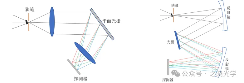 除了offner结构主要的成本在凸面光栅加工,除这种结构外,常用的还有Dyson结构,Czerny-Tuener结构等,如下图所示: