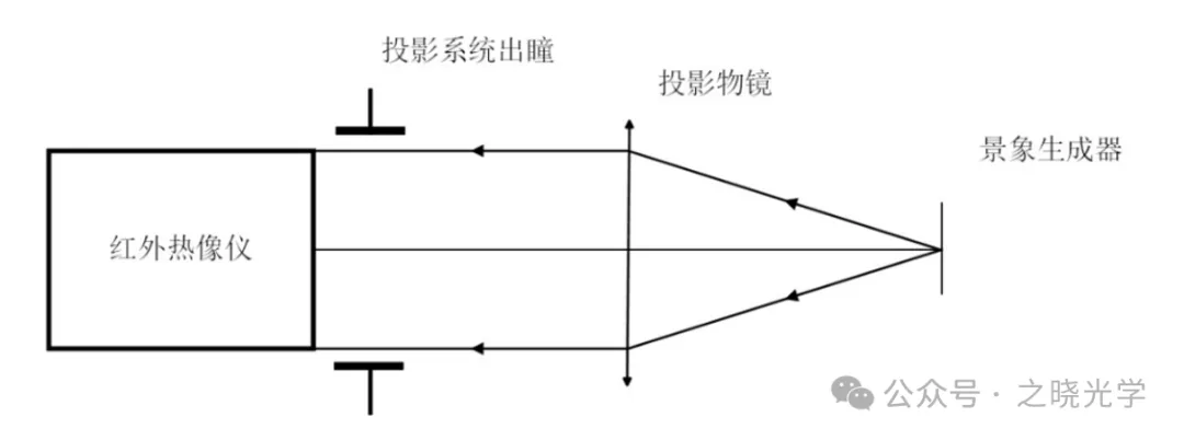 如果在投影物镜前使用准直系统,红外目标模拟器的结构将更为复杂,这将使能量传输效率下降,同时增加成本。若红外目标直接通过投影物镜准直,投影系统出瞳与红外热像仪入瞳耦合,系统结构如图3所示: