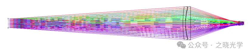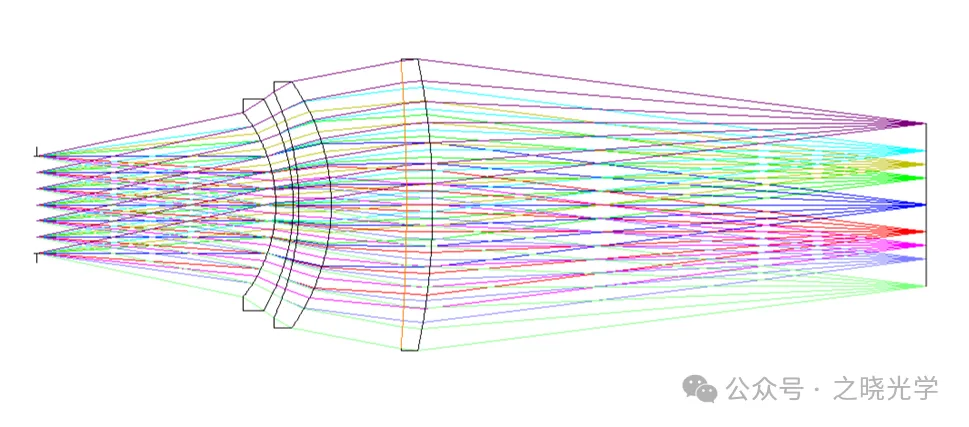 由放大倍率关系,确定视场角为±12°,要求后工作距大于70mm,采用负透镜在前,正透镜在后的三片式结构,为了提高像质,使其中一个光学表面为非球面;同时考虑远心(大家可以思考,对于红外目标模拟器,像方远心有哪些好处?),通过操作数EXPP和OPGT控制出瞳距大于8000mm。优化过程中主要考虑对准直系统的补偿,设计结果如图6所示: