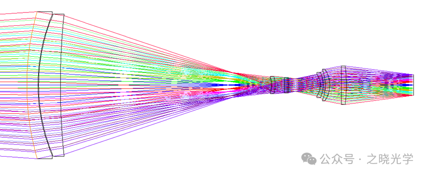 在具体进行设计时,为了方便,以景象生成器平面为像面,以系统出瞳为入瞳,即采取系统整体逆光路设计的方法,此时准直系统入瞳与红外热像仪入瞳匹配。同时为了方便后续投影物镜设计,需要观察准直系统出瞳位置。材料采用硅锗组合,共四片,结果如下图所示: