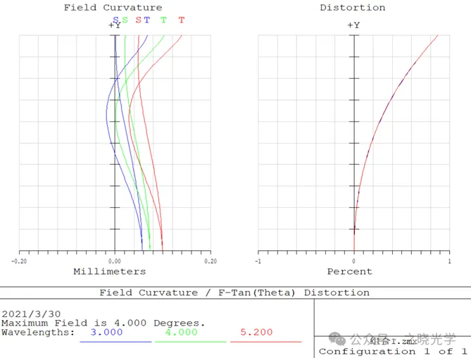 将每个光学表面在Coating选项中设置镀有透过率99%的膜系,计算得系统总透过率最低为±4°视场时的73.05%,对于5.2μm波长,透过率最低为69.72%,点列图及畸变曲线如下: