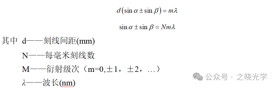 在进行光谱仪光学系统设计时,需要根据光栅方程进行计算,以确定反射镜和光栅参数情况。首先有光栅方程: