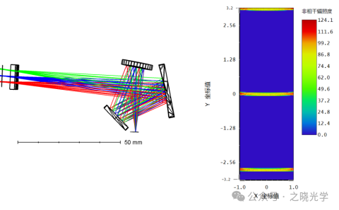为了实现交叉C-T结构,两个反射镜具有一定倾斜量,考虑到像差控制,使第一反射镜倾斜10°,第二反射镜倾斜15°。由于系统整体不具有对称性,将产生明显的像散如图2-4所示,因此在焦面前加入柱面镜进行校正。综上所述初始结构参数如表2-1所示。